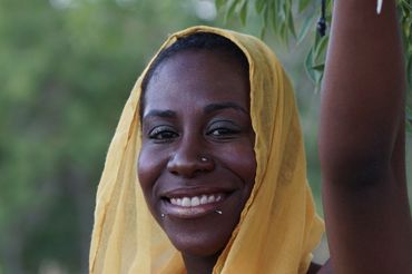 Desert Queen and son wrapped in white fabric seated on desert ground. Smiling at each other.