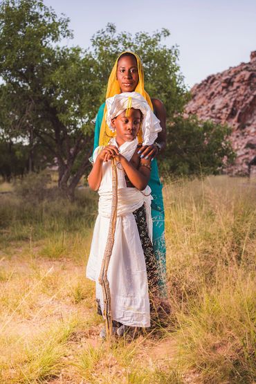 Desert Queen and son wrapped in white fabric seated on desert ground.